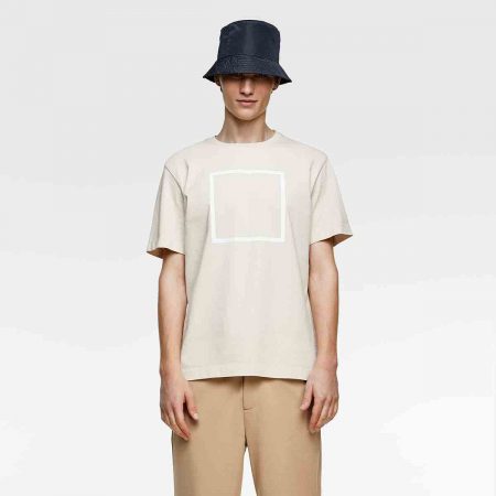 Roomy shirt with round neck and short sleeves. Contrasting front print.